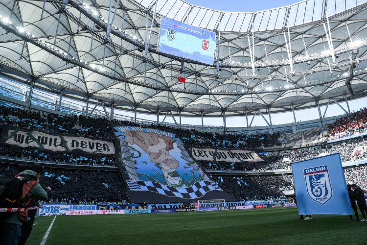 03月29日訊 中超第3輪,大連英博vs長春亞泰,大連梭魚灣迎來2025賽季主場首秀,賽前球迷升起了巨幅TIFO——我們是大連!