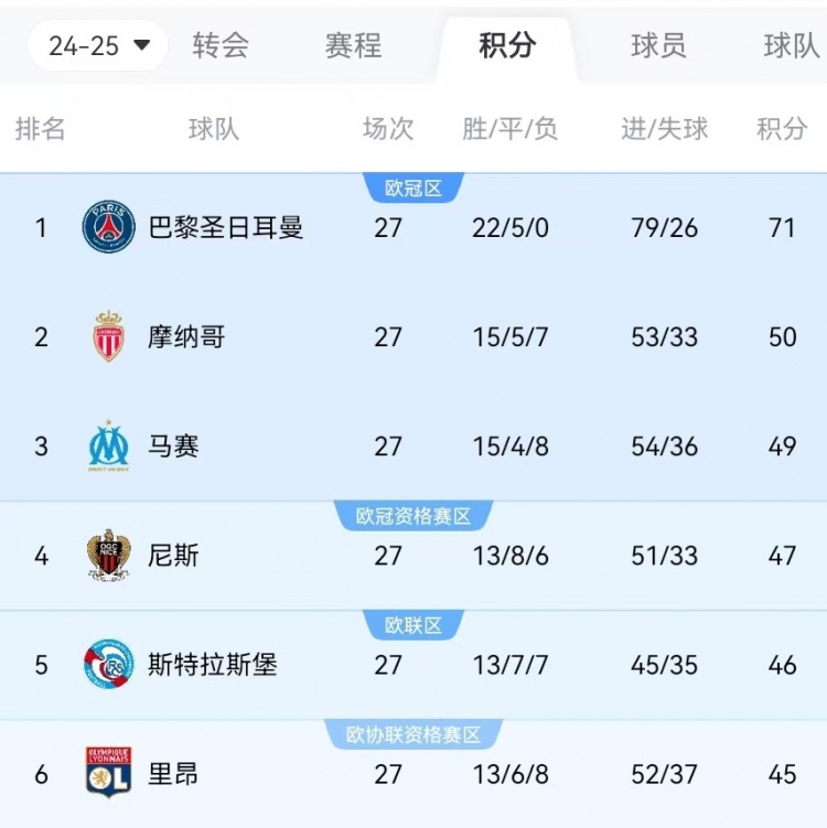 不過如果巴黎輸球而摩納哥贏球,雙方仍將相差18分,盡管凈勝球優(yōu)勢(shì)巨大,但在還剩6輪情況下仍然理論上無法提前奪冠。