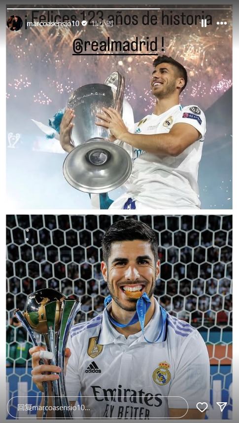 3月7日訊 皇馬成立于1902年3月6日,昨天是皇馬成立123周年的紀念日。前皇馬球員阿森西奧更新了社媒,向俱樂部送上祝賀。