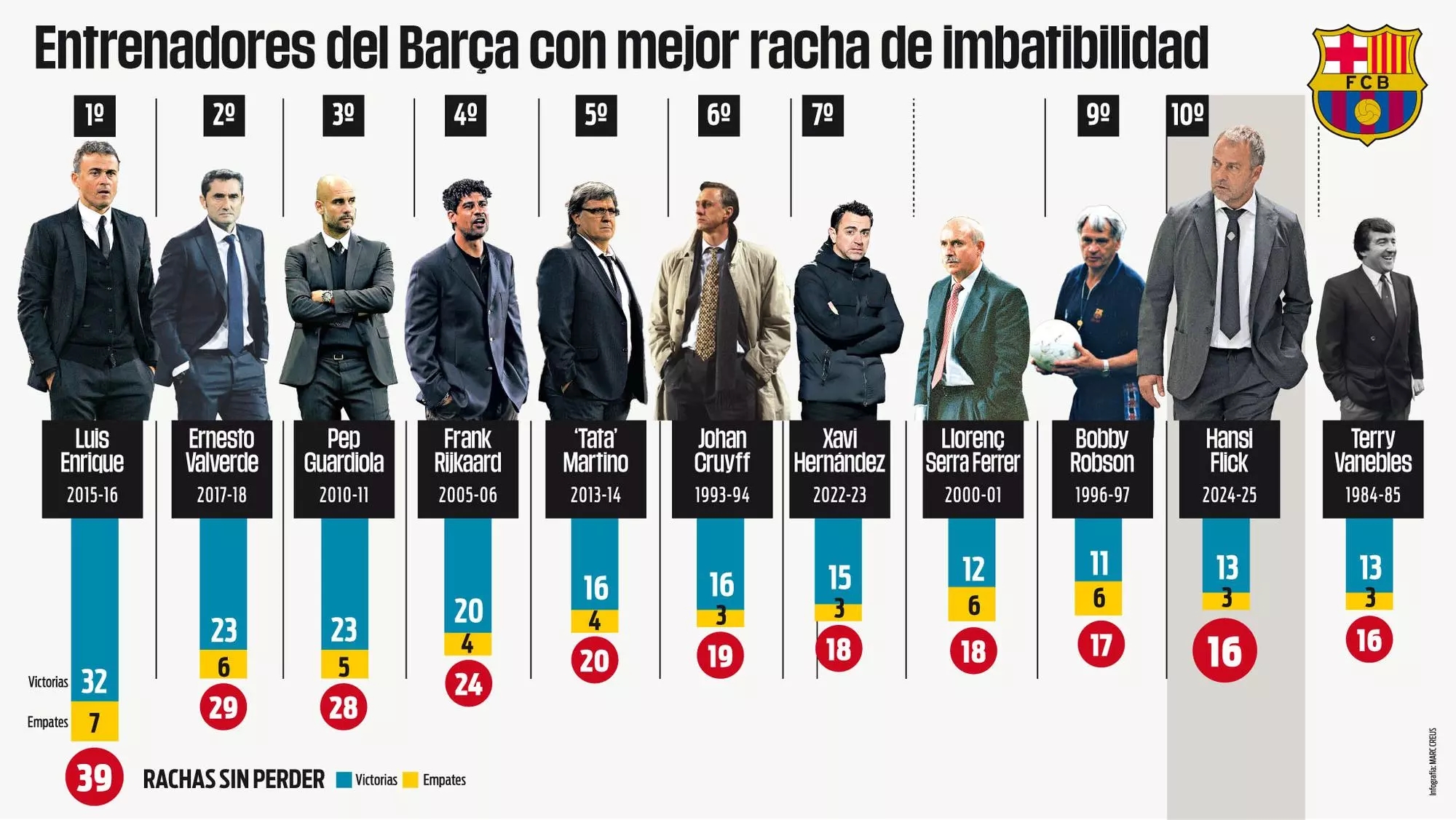 - 弗里克目前率巴薩連續(xù)16場不敗排隊史第10,第1是恩里克的39場