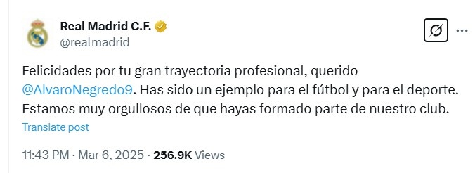 - 皇馬官方:祝賀內格雷多有著偉大的生涯,為你曾是我們一員而自豪