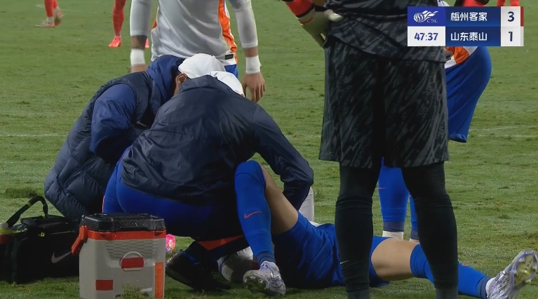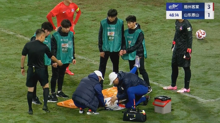 3月29日進行的中超第3輪比賽,泰山vs梅州第50分鐘,王彤遠射后為了躲避封堵失去平衡摔地,隨后被擔架抬下,張弛替補登場。
