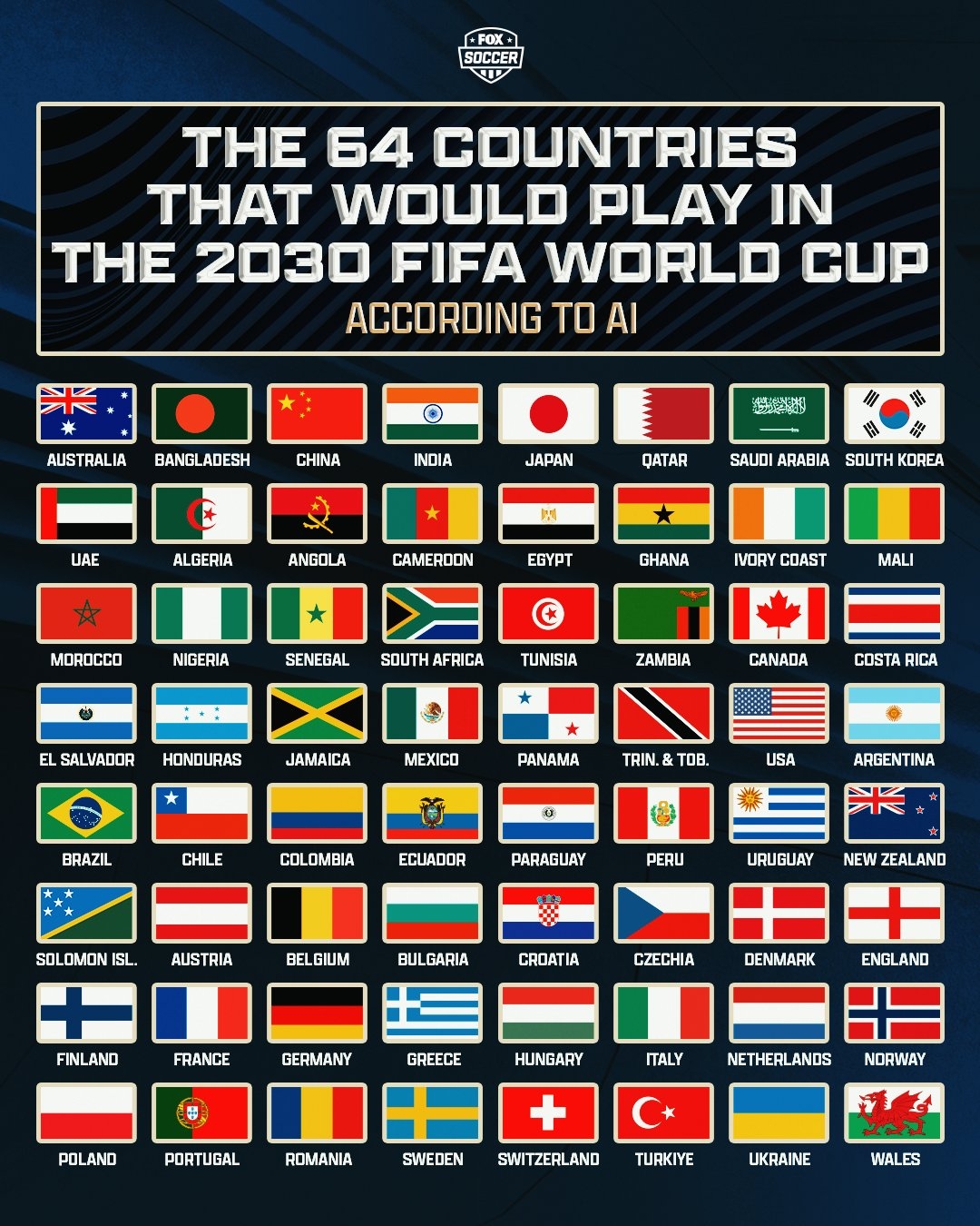 福克斯足球發文,表示要求ChatGPT列出如果2030世界杯擴軍64支隊后所有的64個國家。同時福克斯寫道:你覺得這種形式是個好主意嗎?