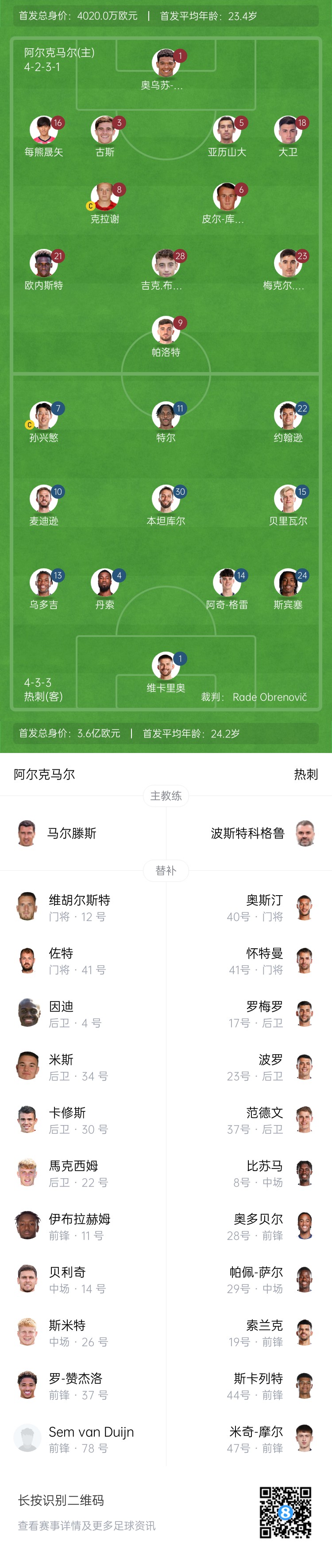 3月7日訊 歐聯杯16強首回合,阿爾克馬爾主場迎戰熱刺比賽即將打響。賽前首發出爐。