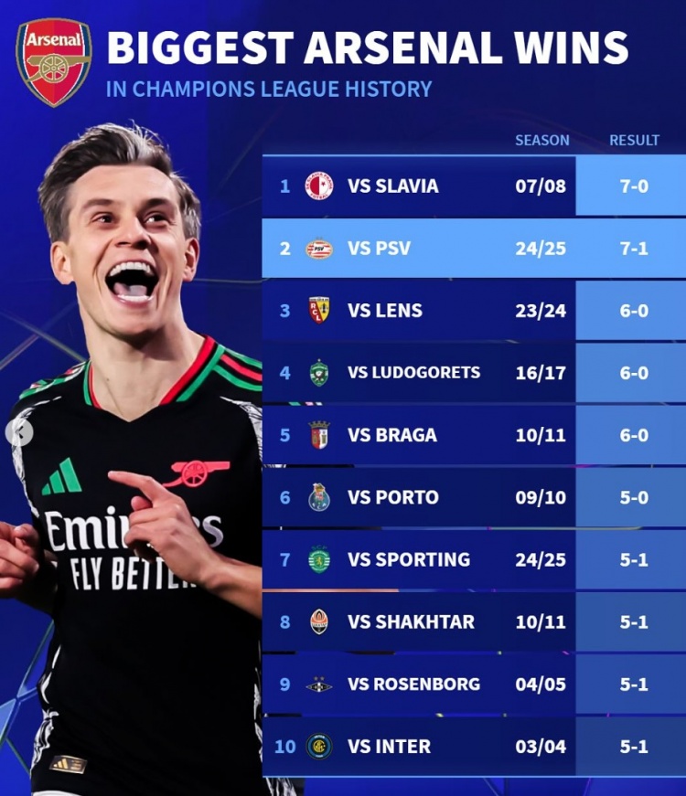 3月5日訊 歐冠16強戰首回合比賽已經先賽4場,阿森納作客7-1痛擊埃因霍溫。《轉會市場》也列出了阿森納隊史歐冠單場最大比分勝利情況。