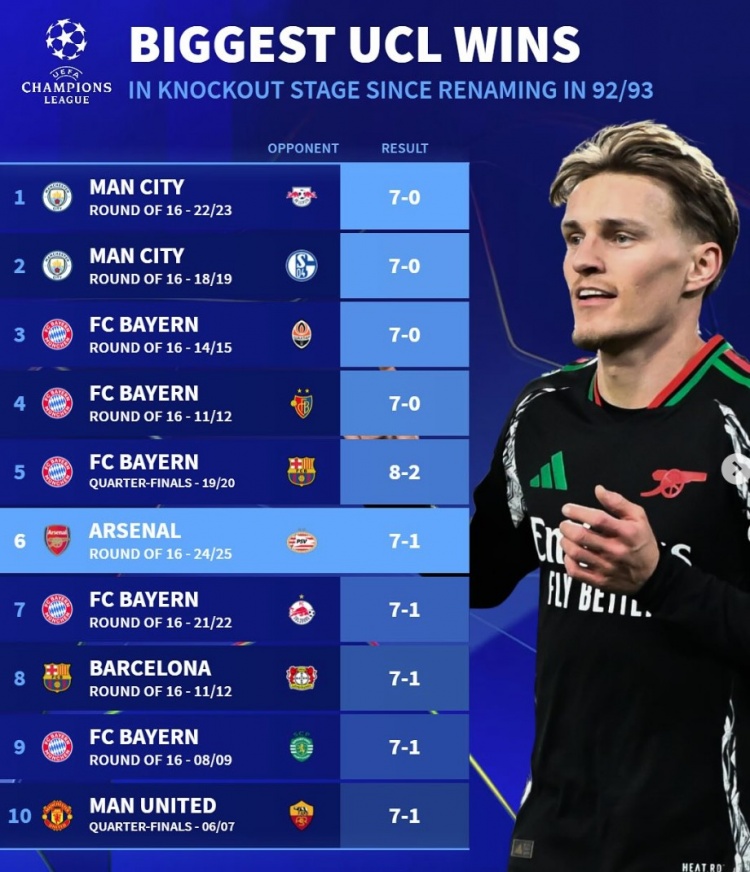 3月5日訊 阿森納在本輪歐冠客場7-1血洗埃因霍溫,《轉會市場》也統計了改制后的歐冠淘汰賽單場最大比分勝利情況。
