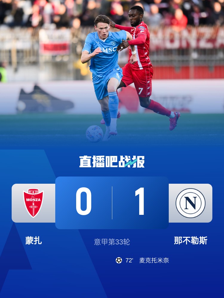 意甲第33輪,那不勒斯客場1-0蒙扎,麥克托米奈制勝。