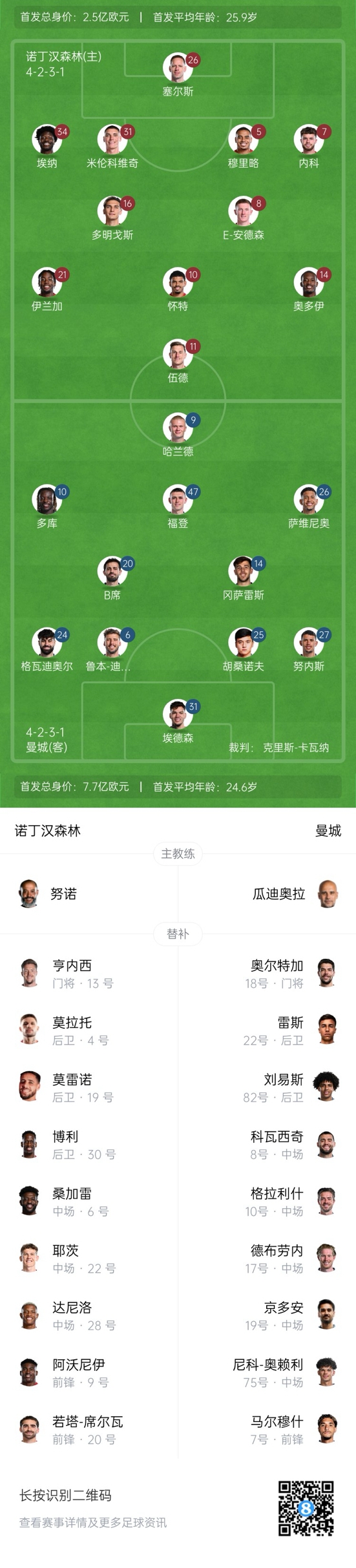 諾丁漢森林首發:26-塞爾斯、5-穆里略、7-內科-威廉姆斯、16-尼古拉斯-多明戈斯、31-米倫科維奇、34-埃納、8-埃利奧特-安德森、10-吉布斯-懷特、11-克里斯-伍德、14-奧多伊、21-伊蘭加
