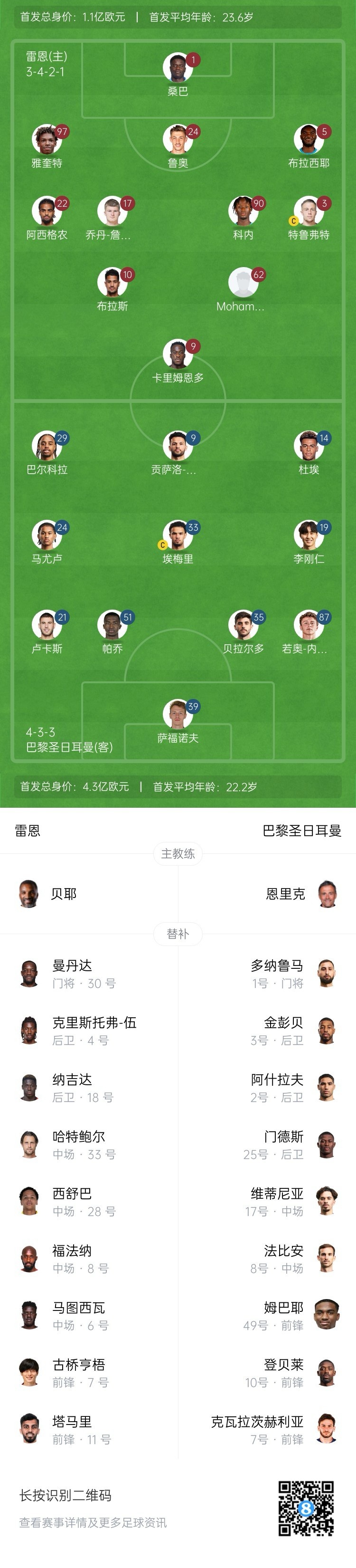 雷恩首發(fā):1-桑巴、97-雅奎特、24-魯奧、5-布拉西耶、22-阿西格農(nóng)、17-喬丹-詹姆斯、90-科內(nèi)、3-特魯弗特、10-布拉斯、62-梅特、9-卡里姆恩多