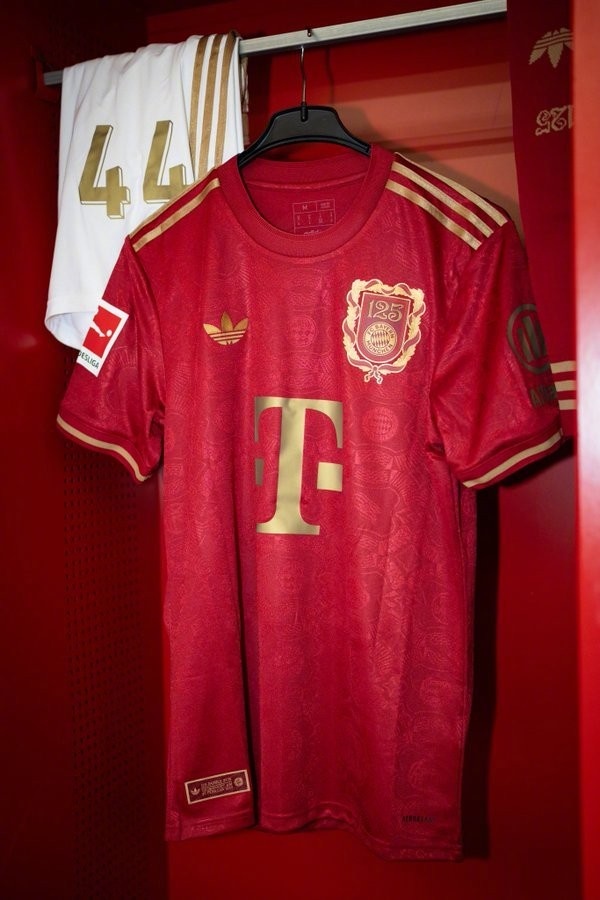 這款獨特的特別版球衣延續了傳統的紅色,并配以金色的品牌標志。此外所設計的紀念徽章則融入了成立文件中的元素、盾形紋章以及巴伐利亞的月桂花環元素,金色的細節則為設計增添了現代感。