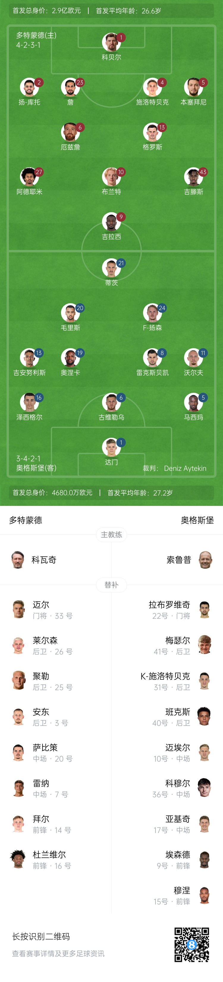 多特首發(fā):1-科貝爾、2-揚(yáng)庫托、4-施洛特貝克、5-本塞拜尼、6-厄茲詹、23-埃姆雷-詹、13-格羅斯、10-布蘭特、9-吉拉西、27-阿德耶米、43-吉滕斯