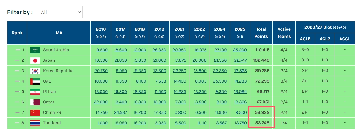 這也意味著中國參加26/27賽季的亞足聯賽事名額從2+1+1降為1+1+1(一支直通亞冠精英正賽+1個亞冠精英附加賽+1支直通亞冠二級聯賽正賽)。