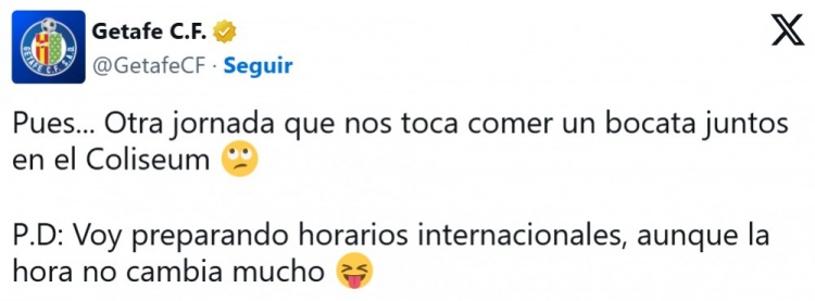 赫塔菲將于本周日下午14:00對陣馬競,而他們下個主場對陣萊加內斯的比賽也是在下午14:00進行。與此同時,西甲聯賽宣布了第29輪的賽程,赫塔菲再次在下午14:00主場迎戰比利亞雷亞爾,俱樂部在社交網絡上調侃這一賽程。