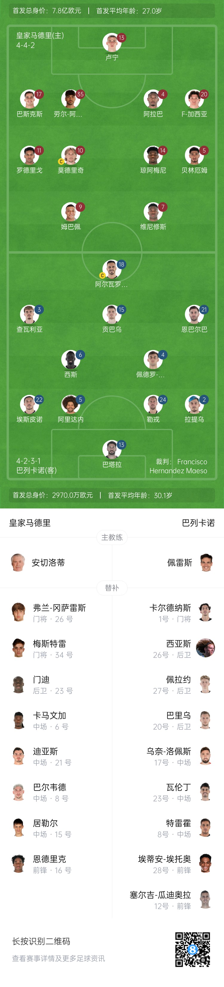 皇馬替補:34-梅斯特雷、26-弗蘭-岡薩雷斯、6-卡馬文加、8-巴爾韋德、15-居勒爾、16-恩德里克、21-迪亞斯、23-費蘭-門迪