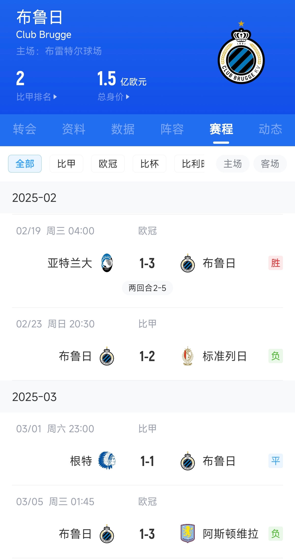 2月23日比甲布魯日1-2不敵標準列日,3月1日比甲布魯日1-1戰平根特,距離榜首亨克9分。3月5日凌晨,布魯日1-3不敵阿斯頓維拉。