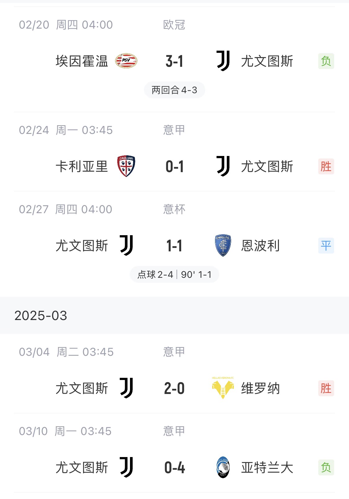 然而近一個月,尤文相繼遭遇歐冠附加賽失利,意杯出局:歐冠附加賽兩回合3-4不敵埃因霍溫,無緣淘汰賽;意大利杯則是點球出局,不敵降級區的恩波利。