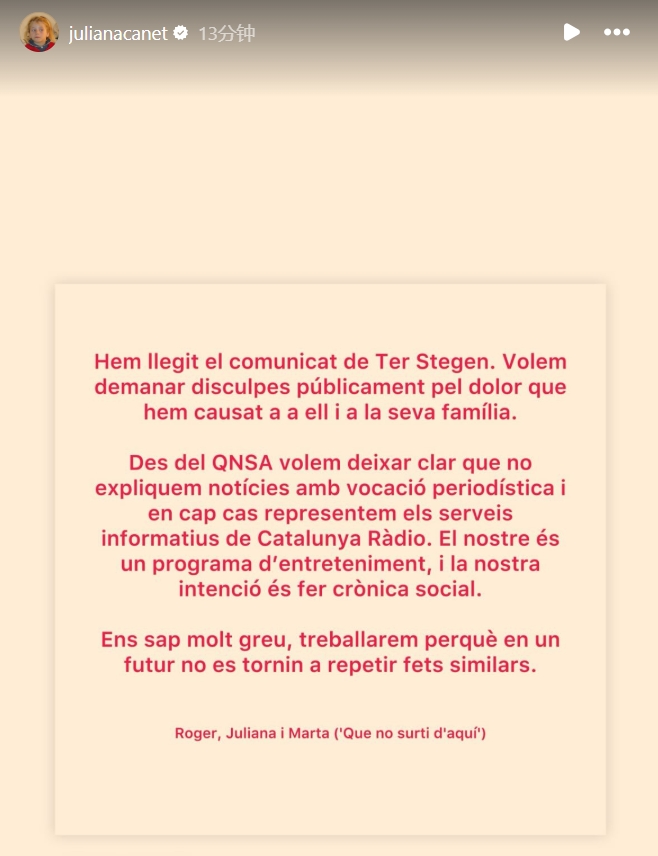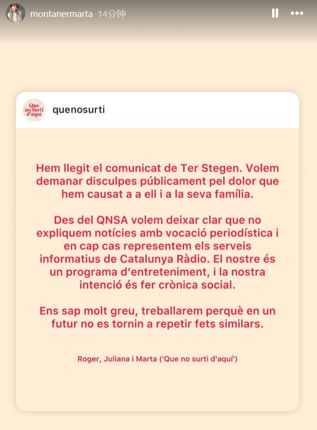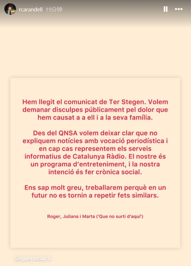 從節目《Que no surti d’aquí》的角度,我們想明確表示,我們并非以新聞視角報道事件,也不代表加泰羅尼亞廣播電臺的新聞服務。我們的節目是娛樂性質的,我們的目的是進行社會紀實。