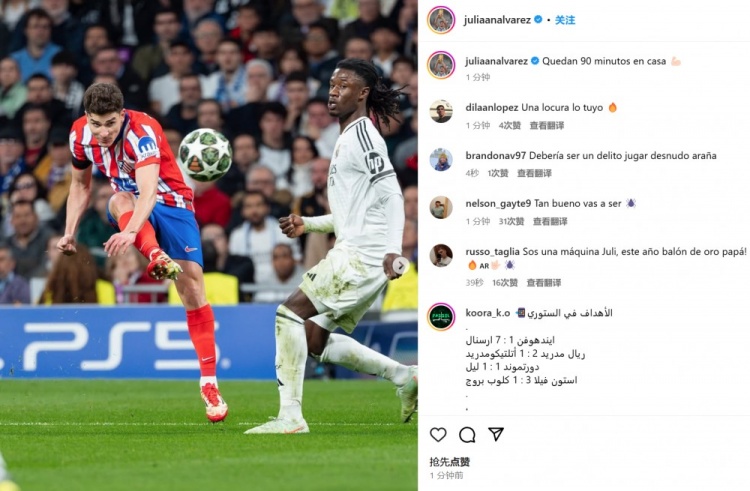 阿爾瓦雷斯也在賽后通過(guò)社媒曬出自己的進(jìn)球瞬間,并配文:“回到主場(chǎng)之后還有90分鐘。”