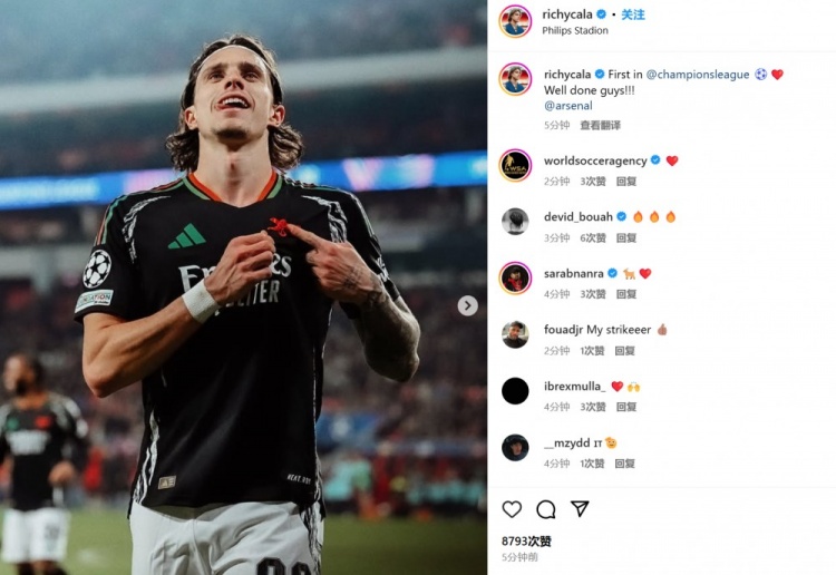 卡拉菲奧里也在賽后通過社媒曬出自己手指隊(duì)徽的慶祝照,并紀(jì)念道:“我的歐冠首球!伙計(jì)們干得漂亮!@阿森納”