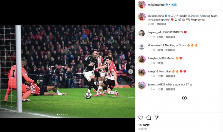 他也在賽后通過社媒曬出自己的進球瞬間,并配文:“7造歷史!@阿森納,難以置信的球隊,難以置信的支持!??????我們繼續努力!”