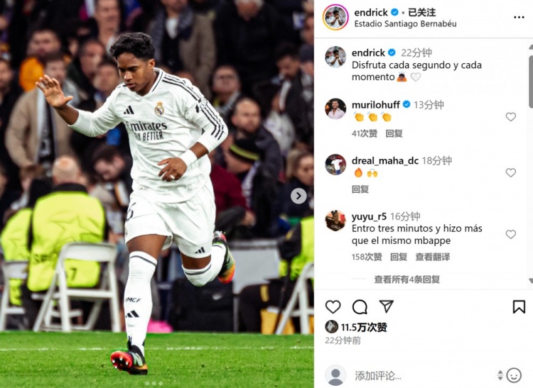 發布時間:2025年03月05日 22:42點擊:欄目:足球新聞 3月5日訊 在本輪歐冠,皇馬2-1擊敗馬競。本場比賽恩德里克在最后時刻替補登場,迎來個人歐冠淘汰賽首秀。賽后他也在個人社媒曬出本場照片,配文寫道:“享受比賽的每一個瞬間!” 本文標簽: 足球 西甲 皇家馬德里 相關閱讀: 庫庫雷利亞:我們要為賽季最后階段努力,要贏得歐協聯冠軍 衛報:英格蘭、蘇格蘭、威爾士北愛爾蘭將聯合申辦2035女足世界杯 實打實的8000萬!拉菲尼亞25球16助,金球獎賠率第3高于維尼修斯 斯基拉:尤文和一些英超俱樂部有意亞特蘭大中場埃德森 三級職業聯賽球隊分布:廣東省8隊最多,山東省6隊第二江蘇省第三 三浦颯太:如果把握機會更強應該能攻破申花大門 回到主場要贏 費迪南德&麥克馬納曼稱贊阿利森:他是利物浦本場比賽的英雄 A費:因黃牌缺席次回合令我傷心 相信球隊能逆轉巴薩 太賊了!埃利奧特走回己方半場并起跑,在門德斯盲區飛速插上絕殺 日本前腰山田康太因騷擾隊友妻子,被大阪鋼巴舍棄
