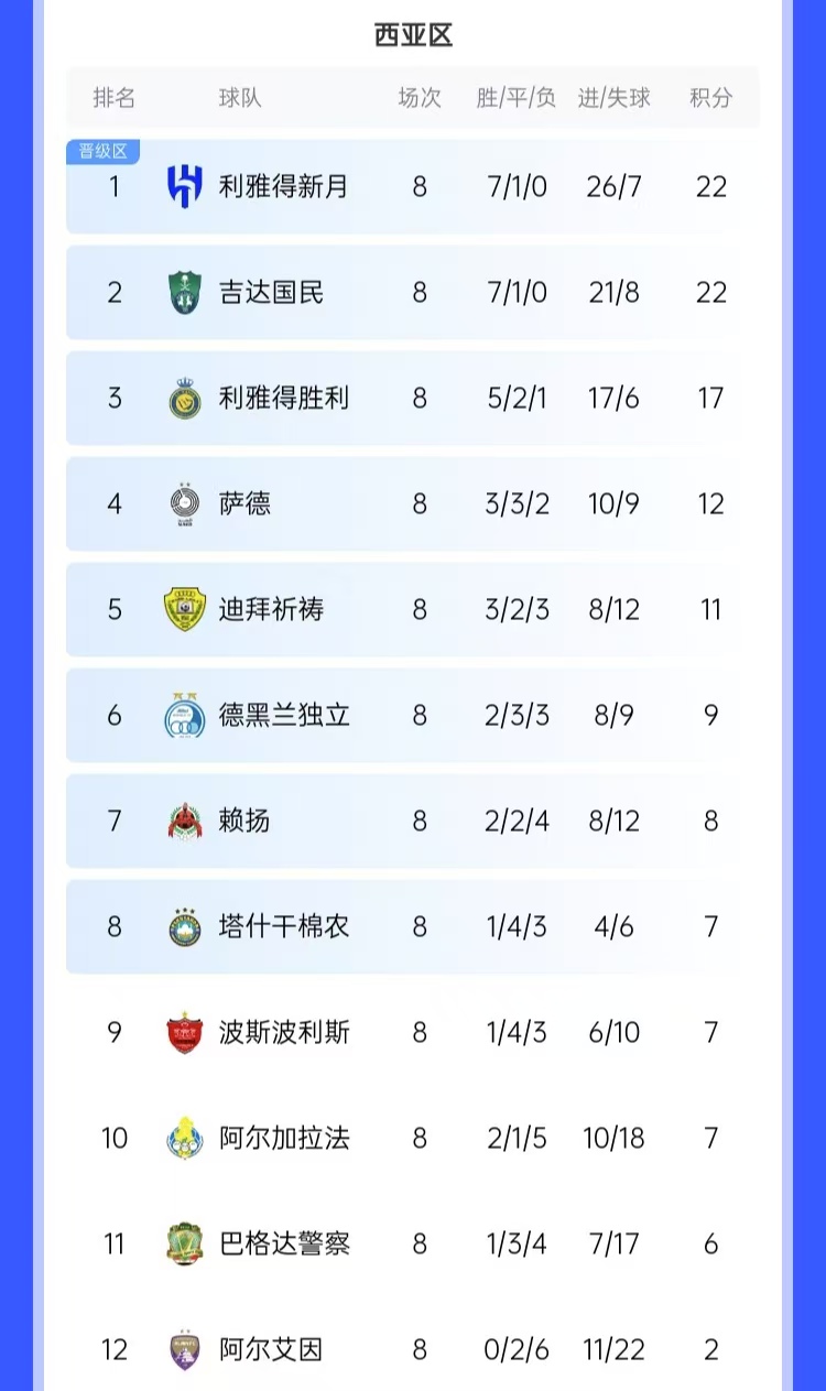 其中利雅得新月首回合0-1落敗但是次回合干脆利落4-0解決戰(zhàn)斗,利雅得勝利首回合0-0打平次回合同樣3-0輕松拿下,吉達(dá)國民則是兩回合直接雙殺對手晉級。此外這三隊也是聯(lián)賽階段西亞區(qū)的前三名,積分?jǐn)鄬宇I(lǐng)先。