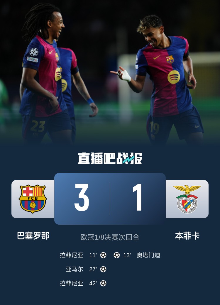 雙殺進8強!巴薩3-1總比分4-1本菲卡 拉菲尼亞2射1傳亞馬爾傳射