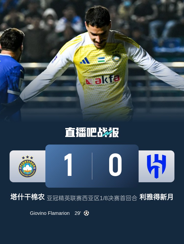亞冠精英聯賽西亞區1/8決賽首回合,利雅得新月首回合0-1塔什干棉農。上半場,弗拉馬里昂撞射破門,布萊希傷退;下半場,米林科維奇錯失良機,新月完成一次門線解圍。