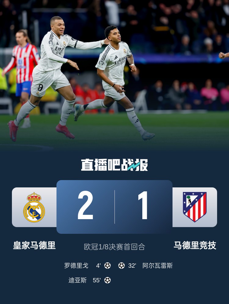 歐冠1/8決賽首回合,皇馬2-1馬競,占據晉級先機。上半場,巴爾韋德助攻羅德里戈內切擺脫防守破門,阿爾瓦雷斯過掉卡馬文加后世界波扳平;下半場,卜拉欣-迪亞斯禁區內蝴蝶穿花步過人后建功。