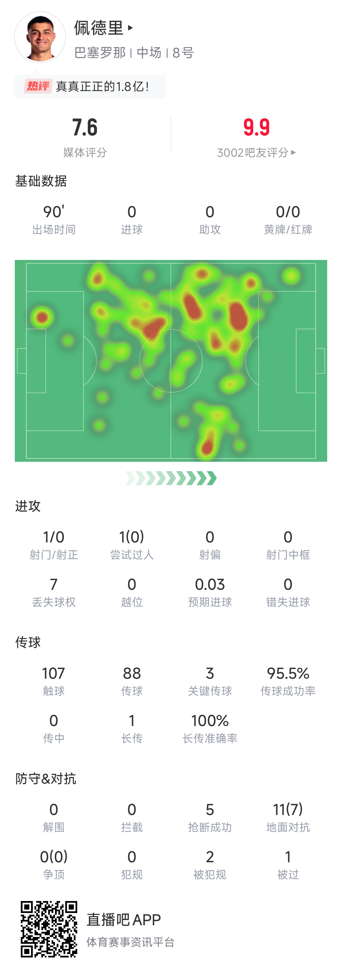 佩德里本賽季幾乎全勤,只缺席巴薩一場比賽,他在41場比賽里貢獻5球6助。不過進球數據并不能體現出佩德里的表現。例如他在本場比賽首發出戰,貢獻3次關鍵傳球,觸球107次僅有7次丟失球權,傳球成功率達到95.5%,另外他還有5次搶斷以及7次地面對抗成功。