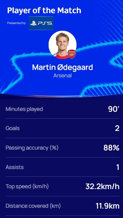 本場比賽厄德高發(fā)揮出色,打進2球并有1次助攻,傳球成功率88%,跑動距離達到11.9km,賽后他也當(dāng)選歐冠官方本場最佳球員。