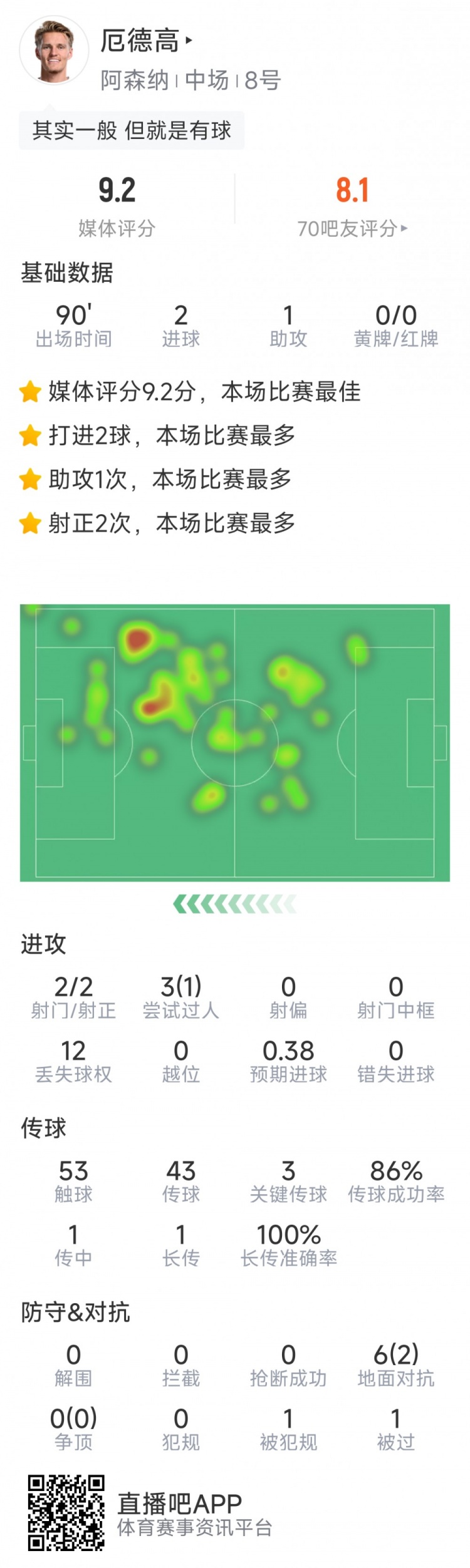 發布時間:2025年03月05日 22:45點擊:欄目:足球新聞 3月5日訊 在本輪歐冠阿森納7-1擊敗埃因霍溫的比賽中,厄德高表現出色,以下為他在本場數據:比賽時間90分鐘2粒進球1次助攻2次射門均射正3次過人1次成功53次觸球3次關鍵傳球傳球成功率86%6次對抗2次成功評分9.2分 本文標簽: 足球 英超 阿森納 相關閱讀: 庫庫雷利亞:我們要為賽季最后階段努力,要贏得歐協聯冠軍 衛報:英格蘭、蘇格蘭、威爾士北愛爾蘭將聯合申辦2035女足世界杯 實打實的8000萬!拉菲尼亞25球16助,金球獎賠率第3高于維尼修斯 斯基拉:尤文和一些英超俱樂部有意亞特蘭大中場埃德森 三級職業聯賽球隊分布:廣東省8隊最多,山東省6隊第二江蘇省第三 三浦颯太:如果把握機會更強應該能攻破申花大門 回到主場要贏 費迪南德&麥克馬納曼稱贊阿利森:他是利物浦本場比賽的英雄 A費:因黃牌缺席次回合令我傷心 相信球隊能逆轉巴薩 太賊了!埃利奧特走回己方半場并起跑,在門德斯盲區飛速插上絕殺 日本前腰山田康太因騷擾隊友妻子,被大阪鋼巴舍棄