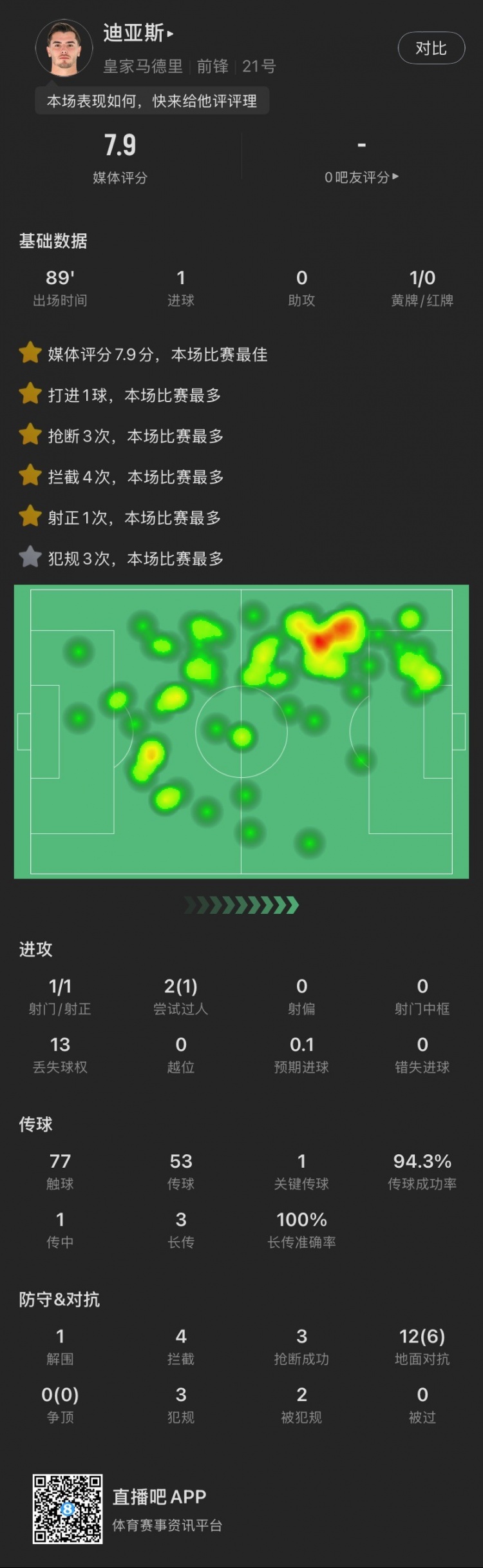 3月5日訊 歐冠1/8決賽首回合焦點戰,皇馬主場2-1擊敗馬競。本場比賽,迪亞斯出場89分鐘打進1球,獲評7.9分全場最高。