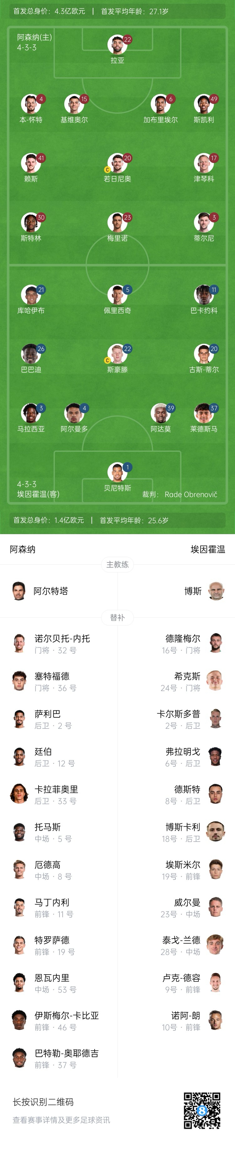 阿森納首發:22-拉亞、4-本-懷特、15-基維奧爾、6-加布里埃爾、49-斯凱利、41-賴斯、20-若日尼奧、17-津琴科、30-斯特林、23-梅里諾、3-蒂爾尼