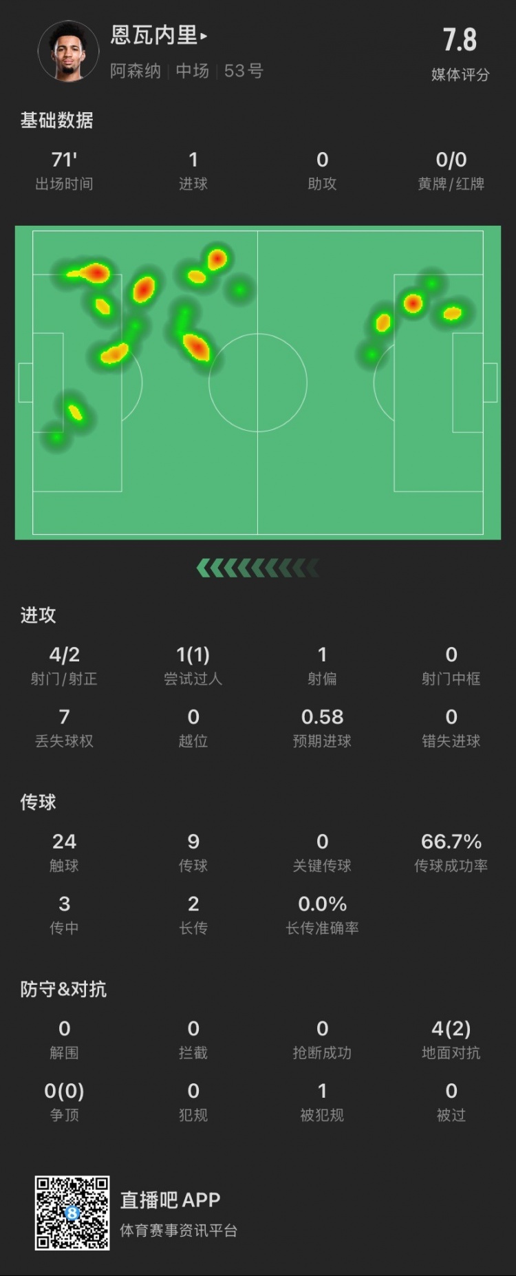 17歲恩瓦內里本場主要數(shù)據(jù)↓