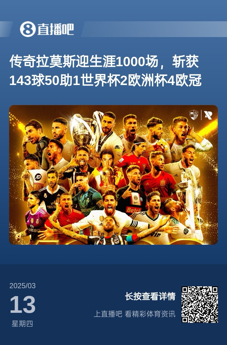 相關閱讀:傳奇????拉莫斯迎生涯1000場,斬獲143球50助1世界杯2歐洲杯4歐冠