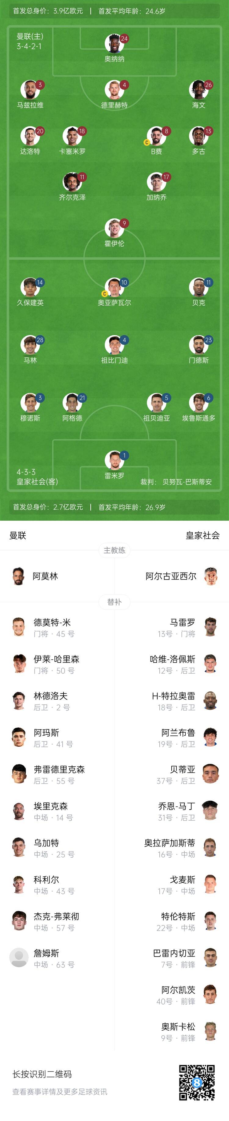 曼聯首發:24-奧納納、3-馬茲拉維、4-德利赫特、26-海文、20-達洛特、18-卡塞米羅、8-B費、13-多古、17-加納喬、11-齊爾克澤、9-霍伊倫