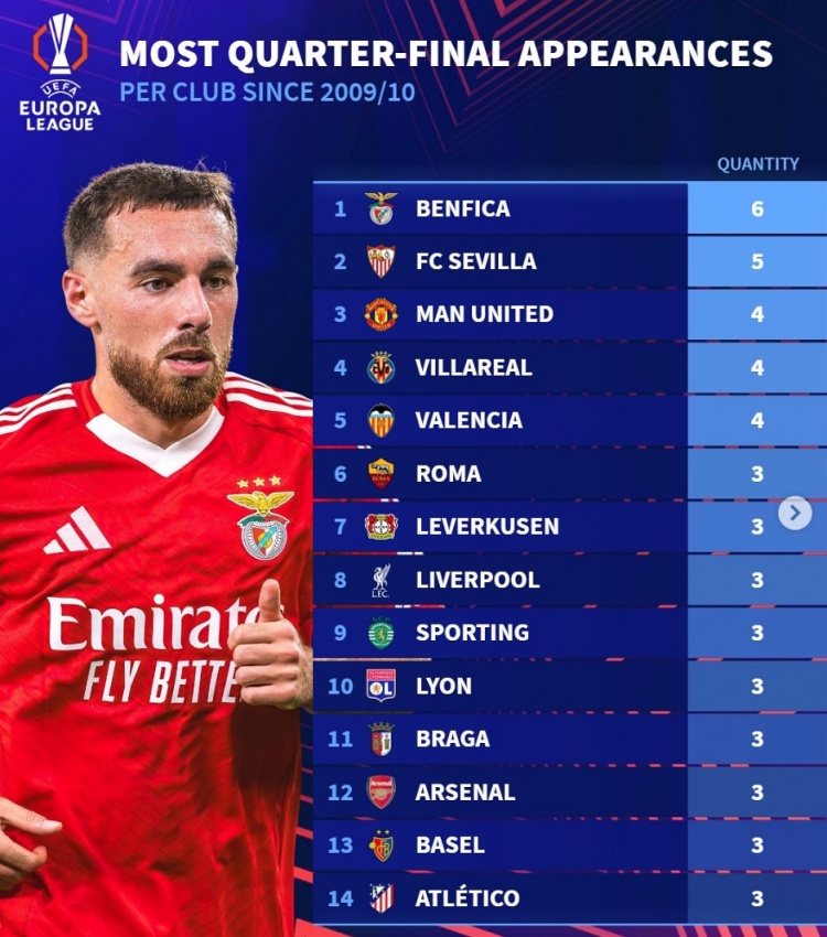 3次,羅馬、勒沃庫森、利物浦、葡體、里昂、布拉加、阿森納、巴塞爾、馬競(jìng)