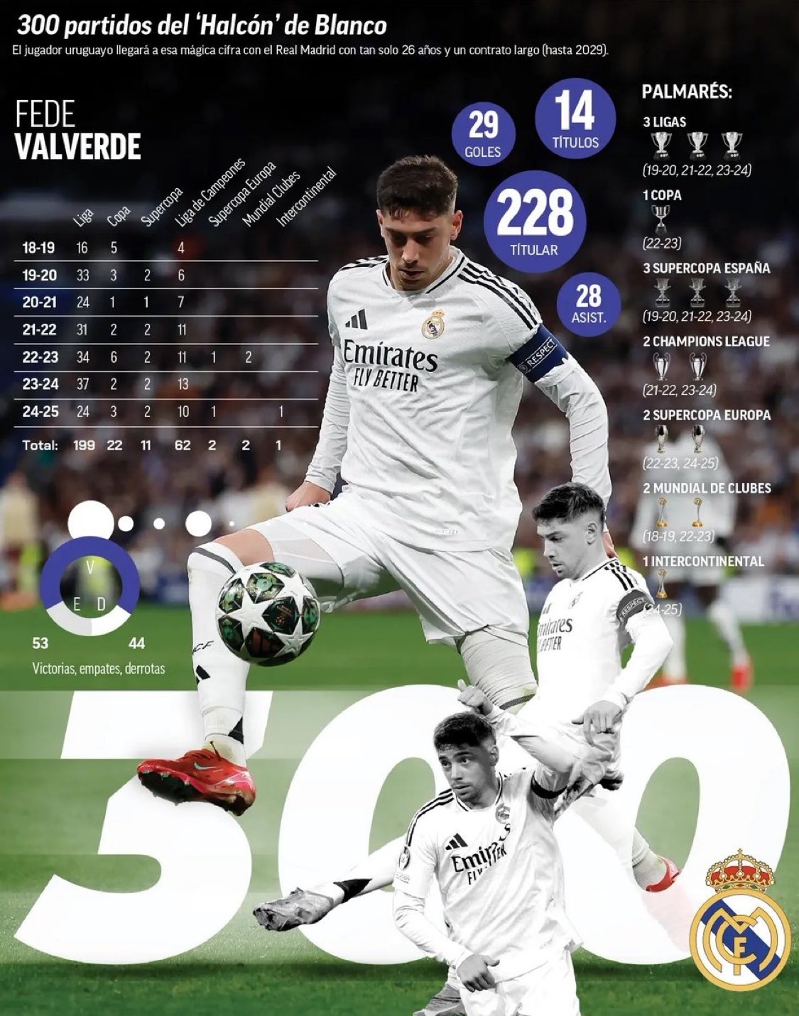 數據統計顯示,巴爾韋德在此前299場貢獻29球28助攻,并隨隊贏得了14座冠軍。