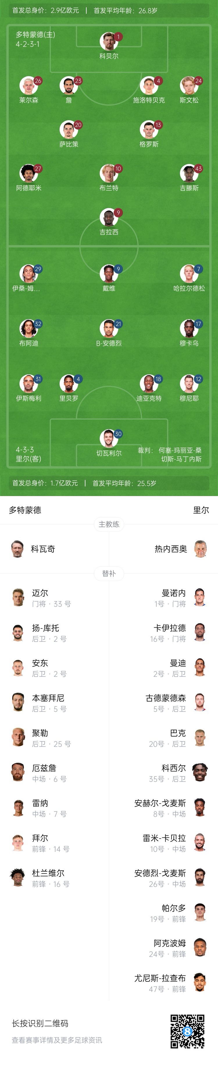 多特首發:1-科貝爾、4-施洛特貝克、26-萊爾森、24-斯文松、23-埃姆雷-詹、20-薩比策、13-格羅斯、10-布蘭特、43-吉滕斯、27-阿德耶米、9-吉拉西