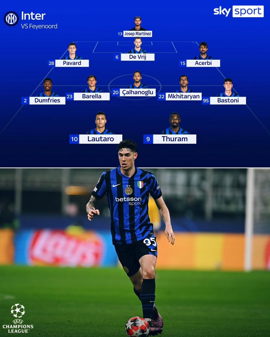 3月5日訊 本周四凌晨1:45,歐冠1/8決賽首回合,國米將在客場對陣費耶諾德。賽前,意大利天空體育預測了國米的首發(fā)陣容。