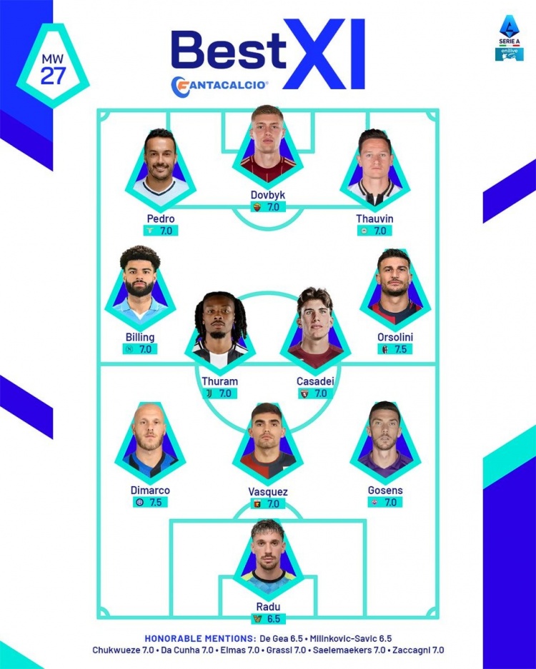 3月5日訊 意甲第27輪聯(lián)賽已經(jīng)戰(zhàn)罷,意甲官方也評(píng)出了本輪聯(lián)賽最佳陣容,K-圖拉姆、迪馬爾科領(lǐng)銜。