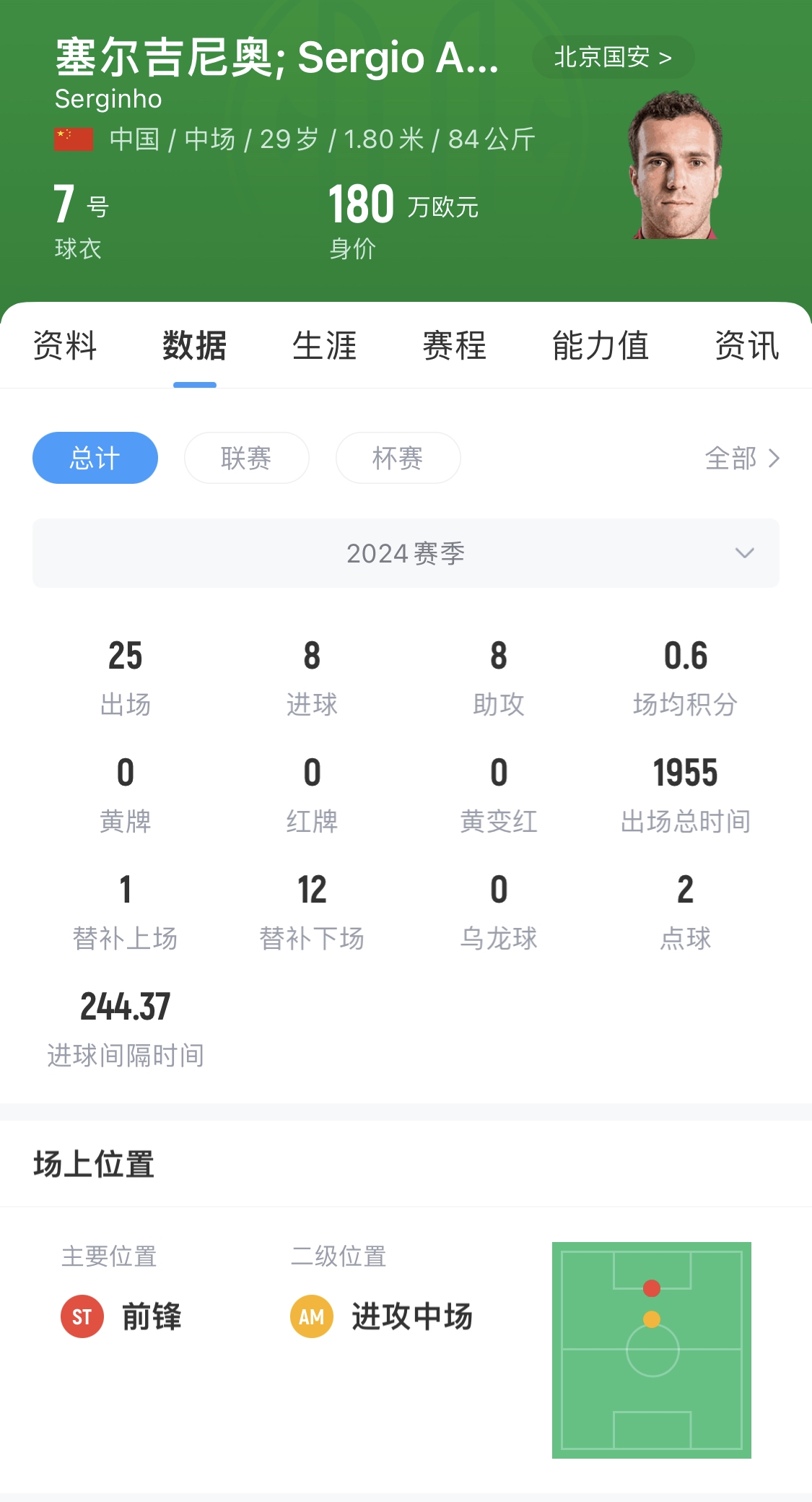 1995年3月15日出生的塞爾吉尼奧原來擁有巴西和意大利雙重國籍,2020年1月加盟長春亞泰,代表球隊出戰100場打進30個進球,完成23次助攻。2025賽季以40萬歐元的身價轉會至北京國安。轉換會籍成功的第二天,塞爾吉尼奧也將迎來自己的30歲生日。