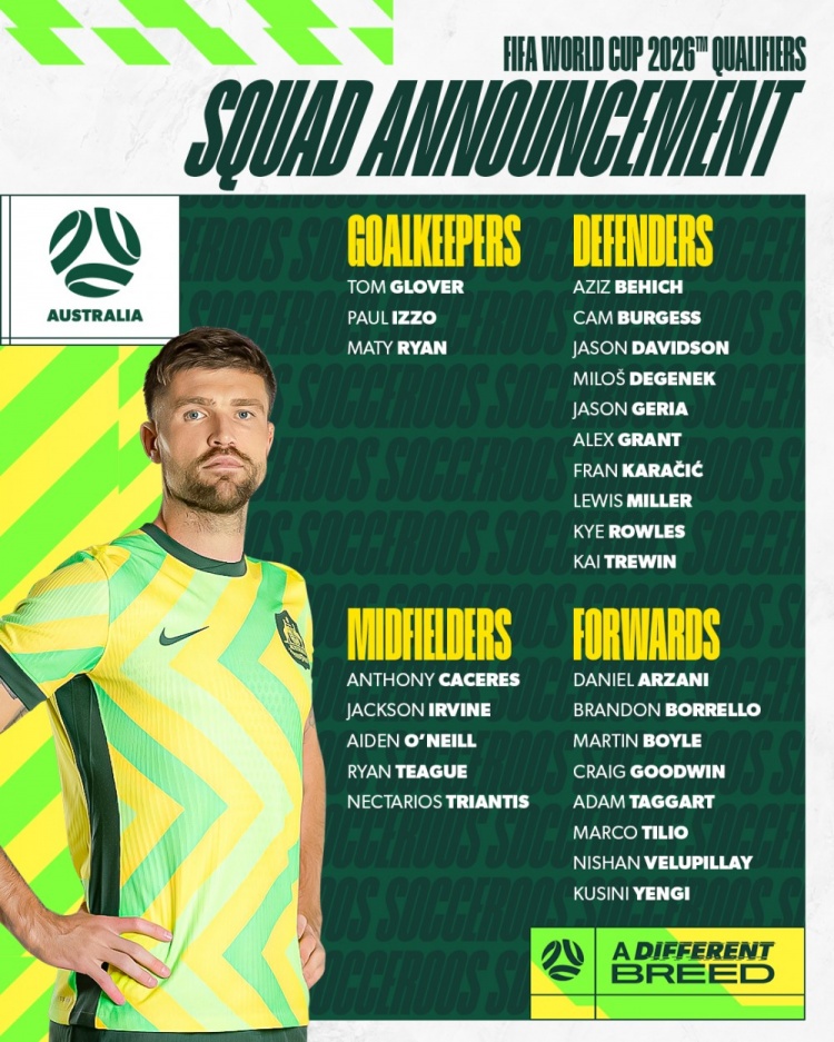【相關】澳大利亞隊世預賽名單:“人民球王”古德溫領銜,3月25號對國足