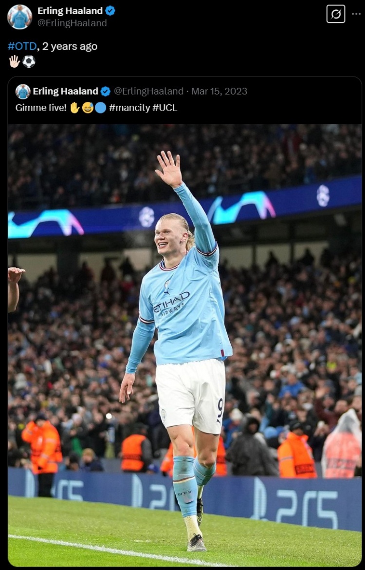 - 兩年前的今天哈蘭德歐冠上演五子登科,球員轉發自己當時社媒