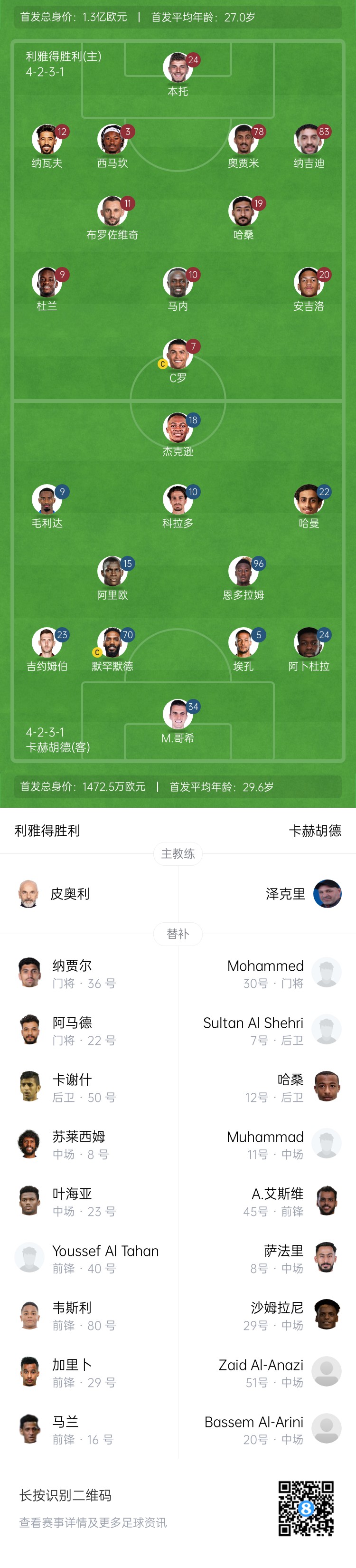 利雅得勝利首發:24-本托、12-納瓦夫、3-西馬坎、78-奧賈米、83-納吉迪、19-哈桑、11-布羅佐維奇、20-安吉洛、10-馬內、9-杜蘭、7-C羅