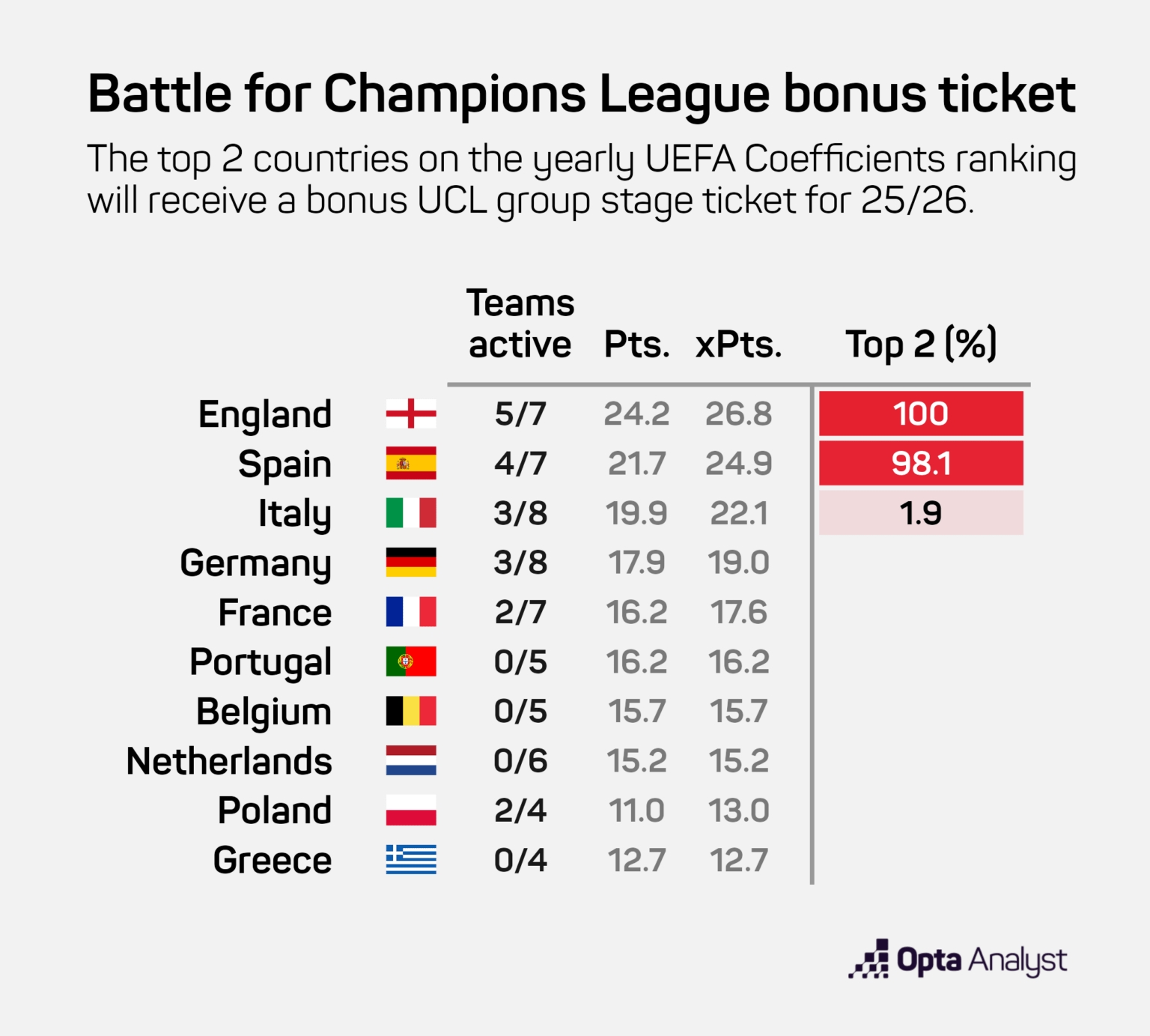 目前英格蘭手握24.25的積分,領先第二名西班牙2.5分。考慮到歐足聯系數分系統的運作方式,在接下來的歐戰1/4決賽階段,只要有一支英格蘭球隊贏得一場比賽,就可以為英超鎖定一個額外的歐冠聯賽席位。