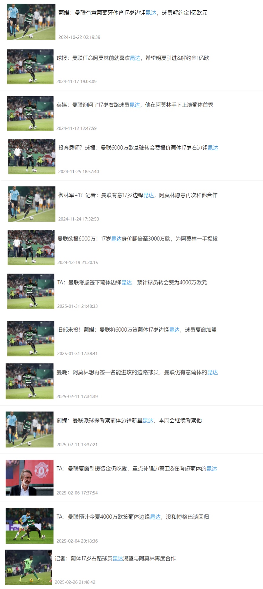 昆達2019年加盟葡萄牙體育青訓,去年夏天被阿莫林提拔至葡體一線隊。從去年10月開始,就持續有曼聯打算簽下昆達的傳聞。