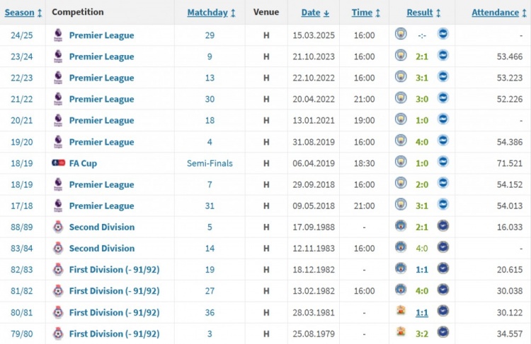 - 12勝2平,曼城歷史上各項(xiàng)賽事主場對陣布萊頓未嘗敗績
