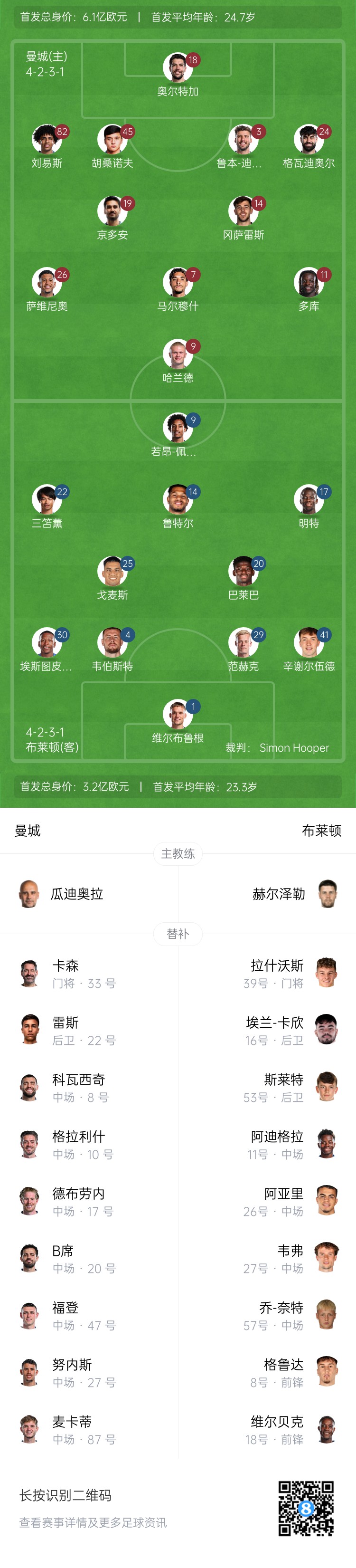 曼城首發:18-奧爾特加、3-魯本-迪亞斯、24-格瓦迪奧爾、45-胡桑諾夫、82-劉易斯、14-尼科-岡薩雷斯、19-京多安、7-馬爾穆什、9-哈蘭德、11-多庫、26-薩維尼奧